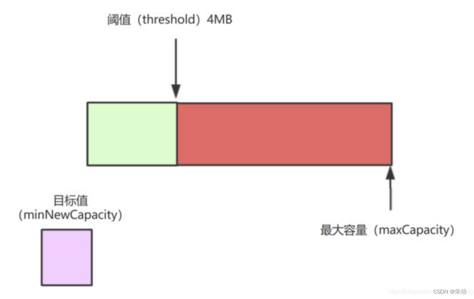 - 扩容过程: 默认门限阈值为4MB,当需要的容量等于门限阈值,使用阈值作为新的缓存区容量 目标容量,如果大于阈值,采用每次步进4MB的方式进行内存扩张((需要扩容值/4MB)*4MB),扩张后需要和最大内存(maxCapacity)进行比较,大于maxCapacity的话就用maxCapacity,否则使用扩容值 目标容量,如果小于阈值,采用倍增的方式,以64(字节)作为基本数值,每次翻倍增长64 -->128 --> 256,直到倍增后的结果大于或等于需要的容量值。