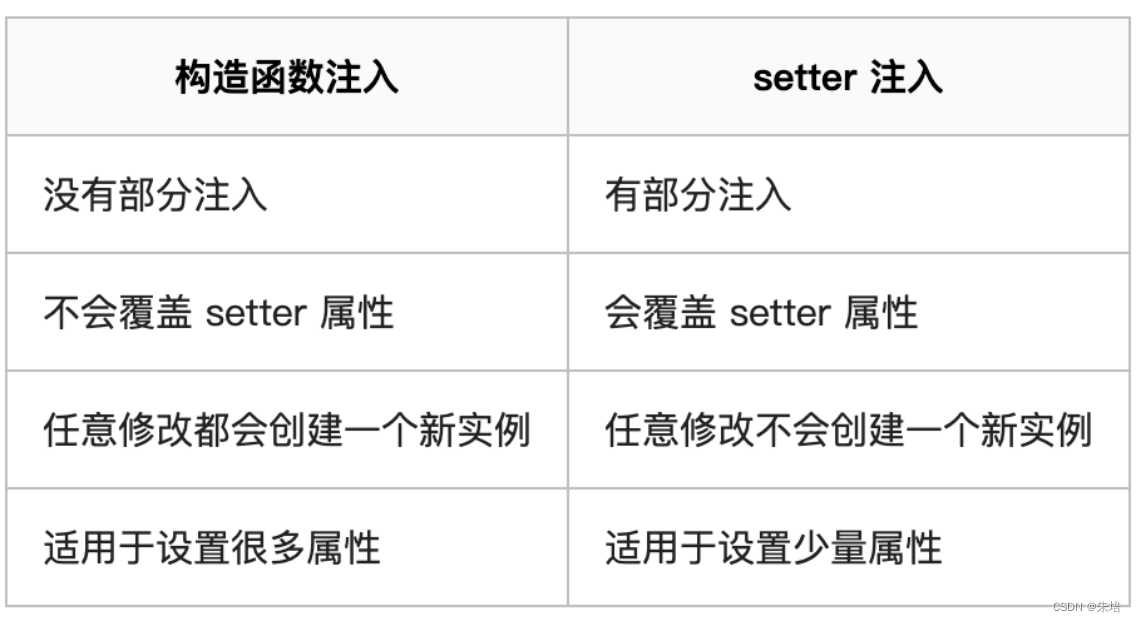 - 依赖注入分为接口注入(Interface Injection),Setter方法注入(Setter Injection)和构造器注入,其中接口注入由于在灵活性和易用性比较差,现在从Spring4开始已被废弃。