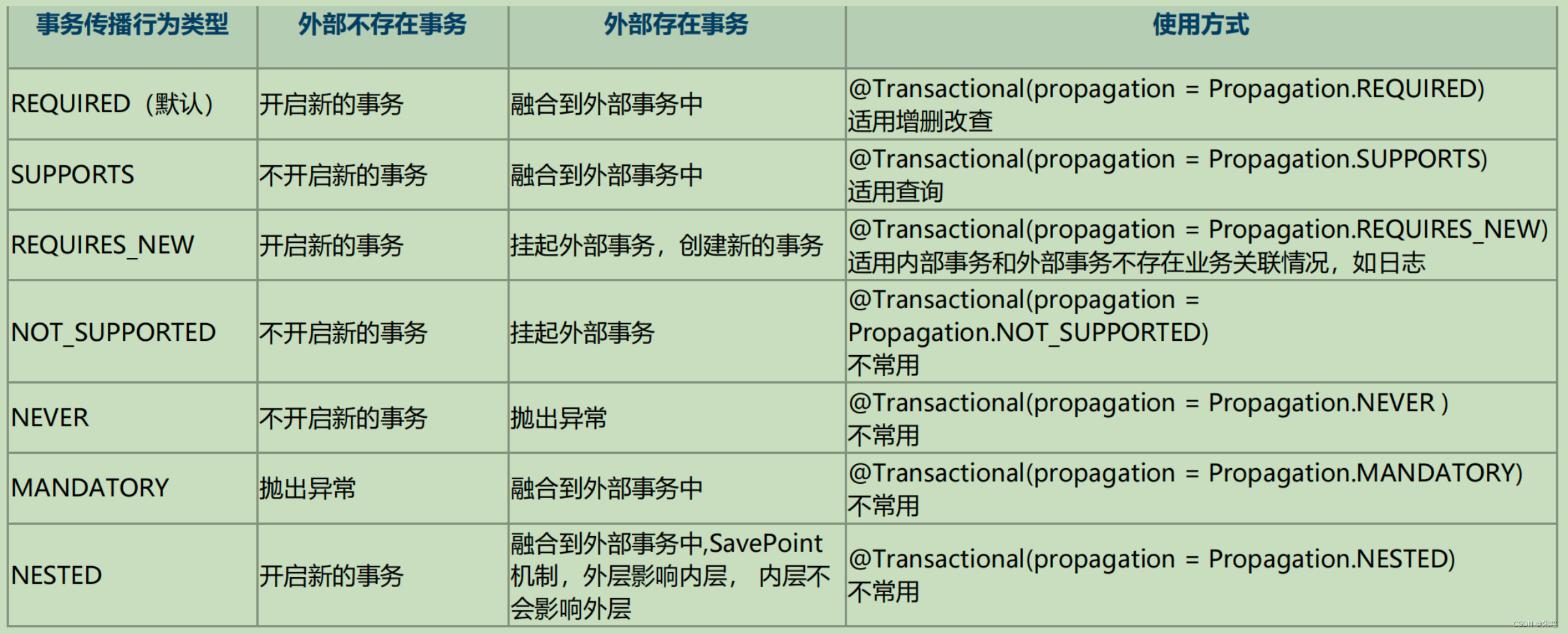 - 例如:PROPAGATION_REQUIRES_NEW 实现原理。a. 创建事务状态对象,获取一个新的连接,重置连接的 autoCommit,fetchSize,timeout等属性b. 把连接绑定到ThreadLocal变量c. 挂起当前事务,把当前事务状态对象,连接等信息封装成一SuspendedResources对象,可用于恢复d. 创建新的事务状态对象,重新获取新的连接,重置新连接的 autoCommit,fetchSize,timeout等属性,同时,保存SuspendedResources对象,用于事务的恢复,把新的连接绑定到ThreadLocal变量(覆盖操作)e. 捕获到异常,回滚ThreadLocal中的连接,恢复连接参数,关闭连接,恢复SuspendedResourcesf. 提交ThreadLocal变量中的连接(导致serviceB被提交),还原连接参数,关闭连接,连接归还数据源