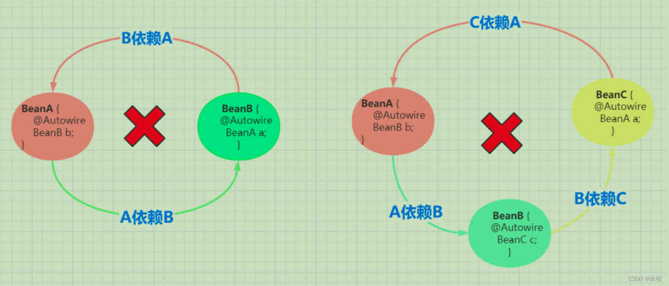 所谓的循环依赖是指,A 依赖 B,B 又依赖 A,它们之间形成了循环依赖。或者是 A 依赖 B,B 依赖 C,C 又依 赖 A。