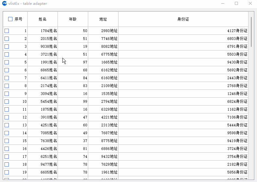 mainForm.vlist.setTable(t,{"<img name='DefaultUncheckedImg',w=14,h=14> 序号","姓名","年龄","地址","身份证"},{80,100,100,100,200},0x2);
