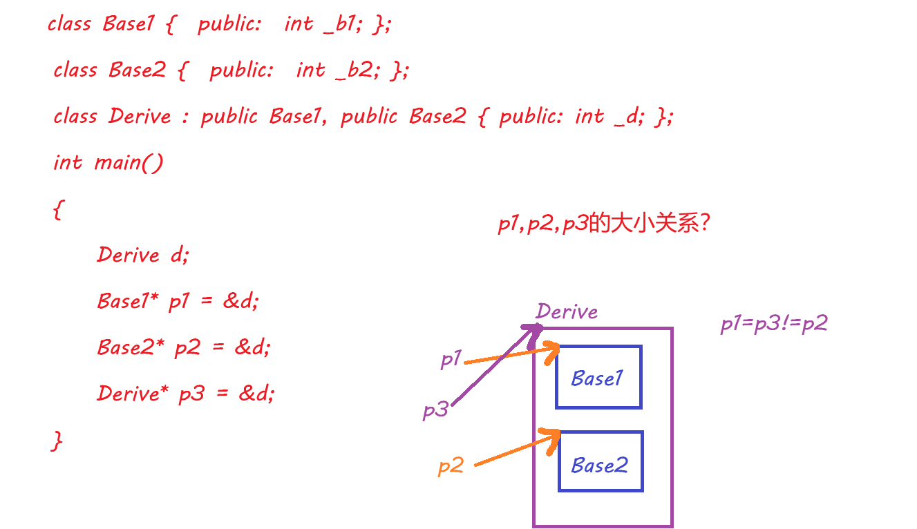 多继承,子类继承了多个父类,多继承的这个派生类中,多个父类在内存中的顺序是,先继承的基类在前面,后继承的在后面,派生类的成员在最后