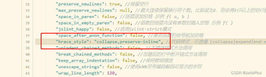 二、修改 jsbeautifyrc.js中的 "brace_style" 属性值为 "collapse,preserve-inline"。