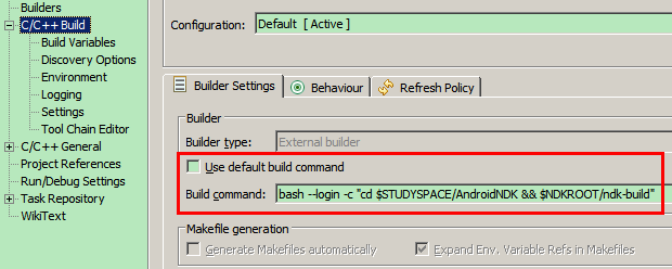 4、右键工程属性,选中C/C++ Build,取消Use default build command,改为“bash --login -c "cd $STUDYSPACE/AndroidNDK && $NDKROOT/ndk-build"”。(cygwin下配的东西,你懂的,可以偷点懒==)