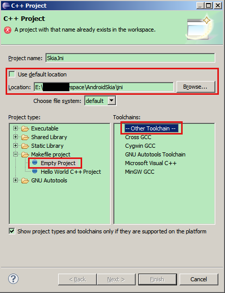 3、在你的C版Eclispe建立C++工程。注意取消Use default location,选择你工程下的jni目录。Project type选择Empty Project。Toolchains选择Other Toolchain。
