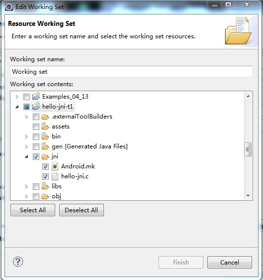 其中,在配置Build Options的时候,点击Specify Resources按钮,选中工程下的jni文件夹如下: