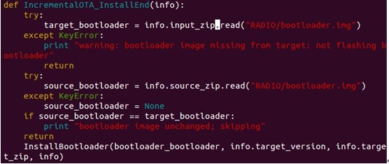 将releasetools.py脚本IncrementalOTA_InstallEnd(info)函数中的 target_bootloader=info.input_zip.