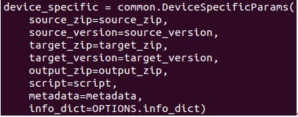 从ota_from_target_files脚本中WriteFullOTAPackage()和WriteIncrementalOTAPackage这两个函数(分别用来生成全包和差分包)可以发现,在他们的开始部分都对device_specific进行了赋值。其中WriteFullOTAPackage()对应的参数是input_zip和out_zip,而WriteIncrementalOTAPackage对应的是target_zip,source_zip,out_zip,我们可以看一下在WriteIncrementalOTAPackage函数中这部分的具体实现: