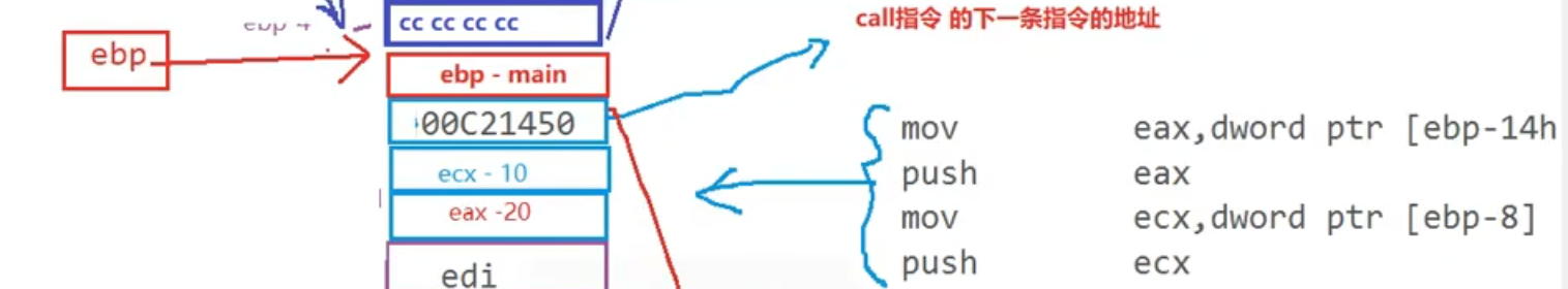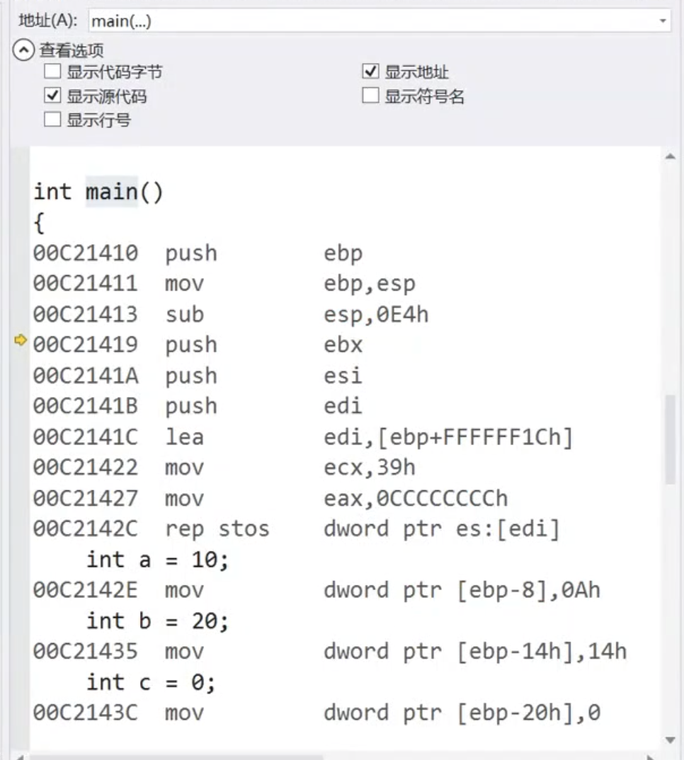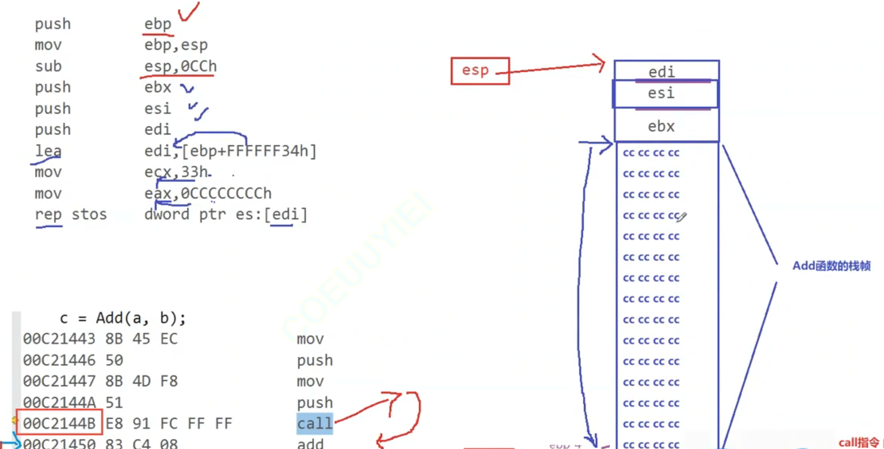 接着压入栈了三个值:ebx,esi和edi,每压入一个值,esp都要变化。lea(全称load effective address)就是把后面的有效地址加载到edi中,然后将开辟的main函数栈帧部分的值全部初始化成0xCCCCCCCC。 这也就能解释为什么当我们创建变量不赋初始值的话,变量会是随机值。
