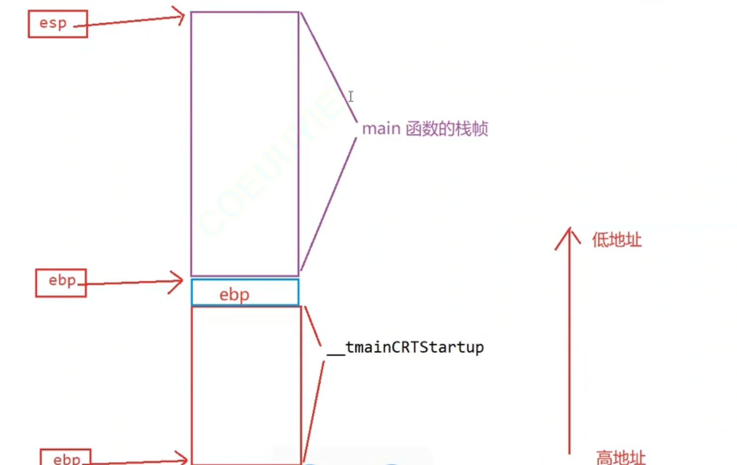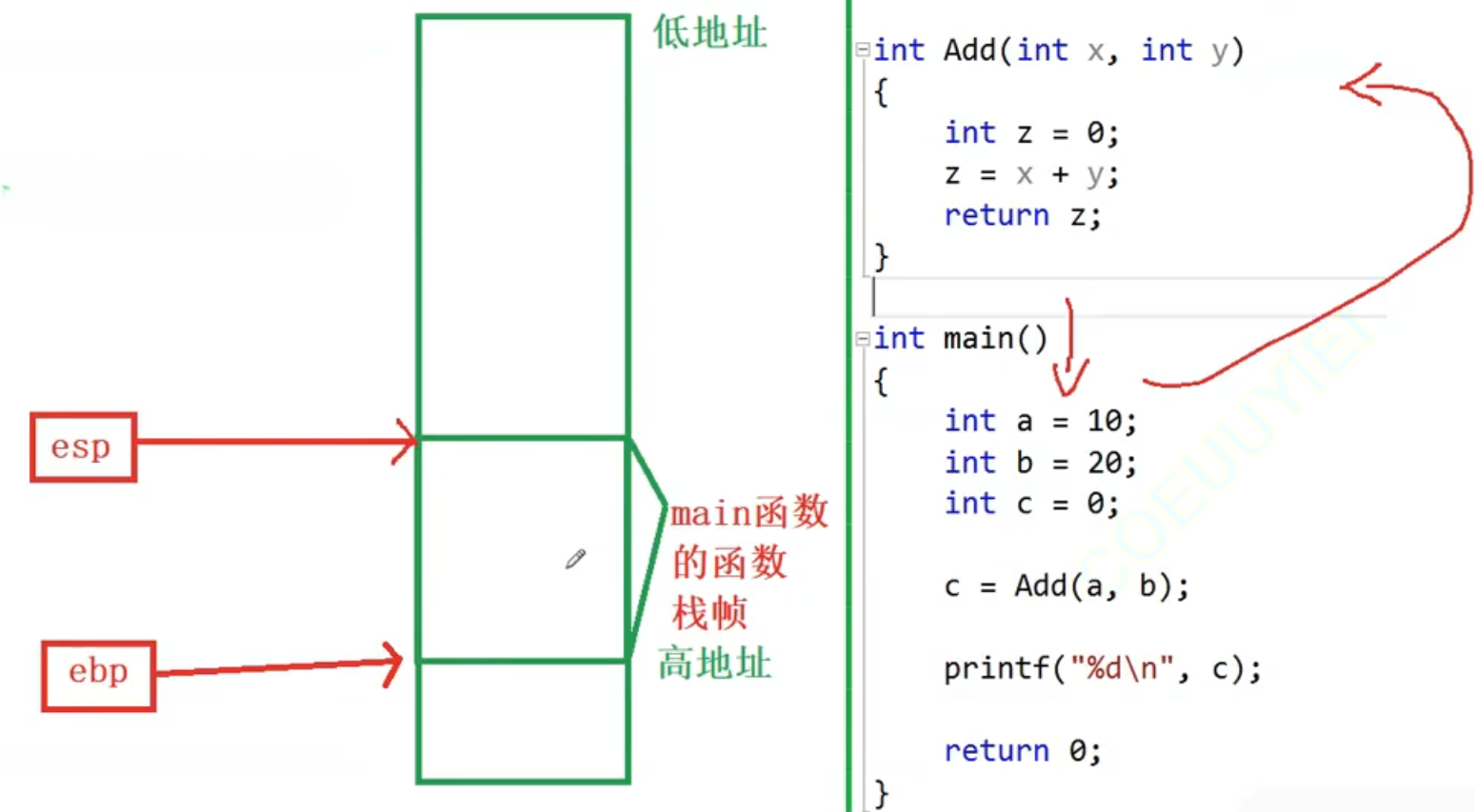 在讲解函数栈帧之前,我们首先要了解两个寄存器——esp 和 ebp。这两个寄存器存放的是用来维护函数栈帧的地址。而每一个函数调用,都要在栈区创建一个空间。具体如下图所示: