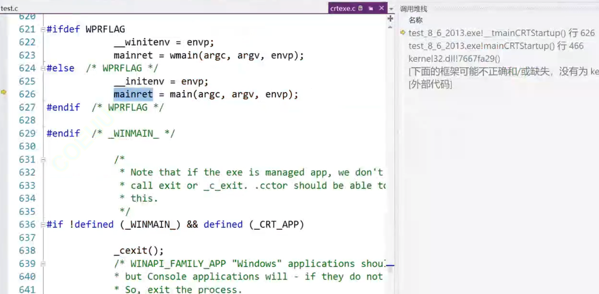 在VS2013中,main函数是被__tmainCRTStartup这个函数调用的,而这个函数又是被mainCRTStartup函数调用的。那具体是怎么调用的,我们转到反汇编: