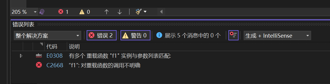 注:下面代码中的两个函数能构成重载,但是在调用f()时会报错,因为存在歧义,编译器不知道该调用谁。