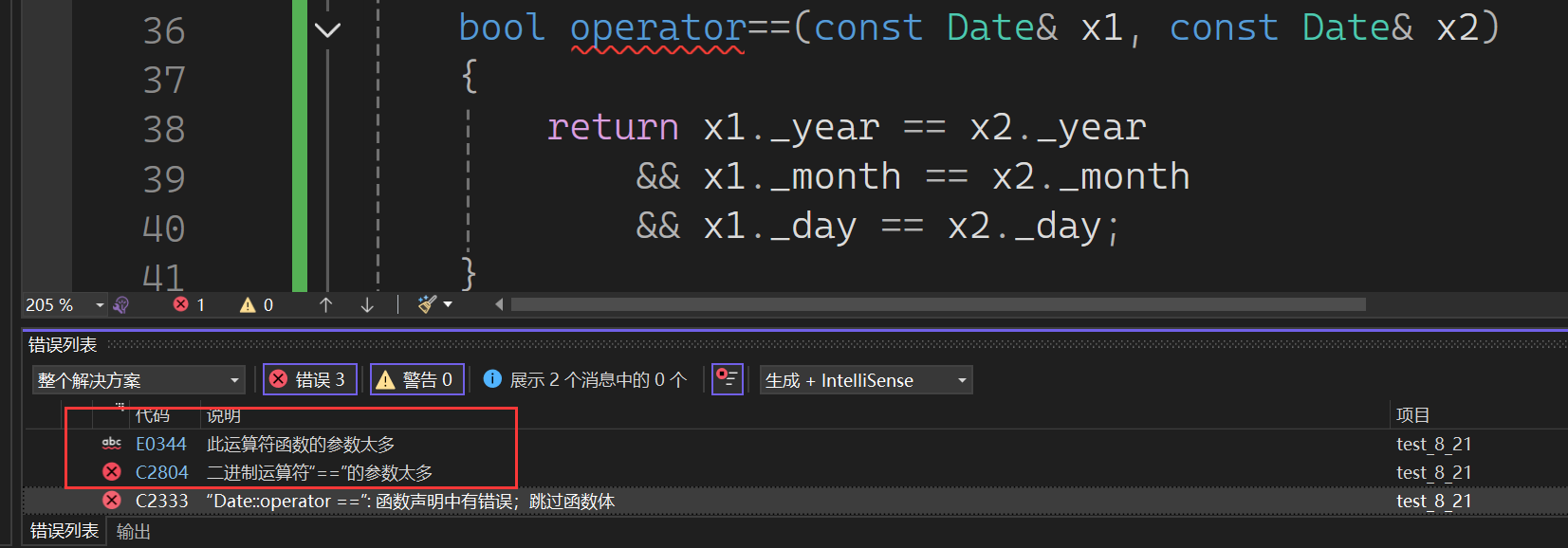 程序提示我们函数参数太多,那为什么会这样呢?不要忘了,成员函数的参数部分还有一个隐藏的this指针,所以这里的成员函数其实有三个参数,而==运算符是二元运算符,所以才会提示参数过多。总结一下,如果一个重载运算符函数是成员函数,则它的第一个运算符对象默认传给隐式的this指针,因此运算符重载作为成员函数时,参数比运算对象少一个。正确的代码如下: