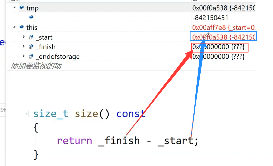 但是_start 是没有问题的,也就是说size() 出现了问题,导致_finish 的值为空。而size()函数是由_finish - _size构成的,_finish 是初始值0,但是此时的_start 已经是新的_start了。如下图所示: