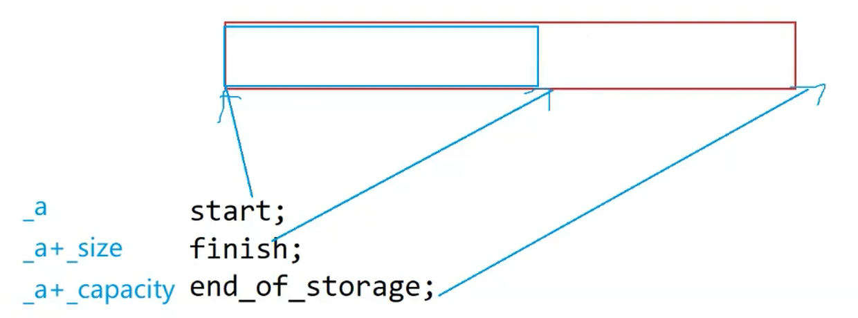 关于vector的成员变量,可能有人会模仿string来定义_a,_size和_capacity。这样定义固然没有什么问题,但是在C++标准库中的vector底层的成员变量是由三个迭代器类型的变量构成的(如下图所示)。
