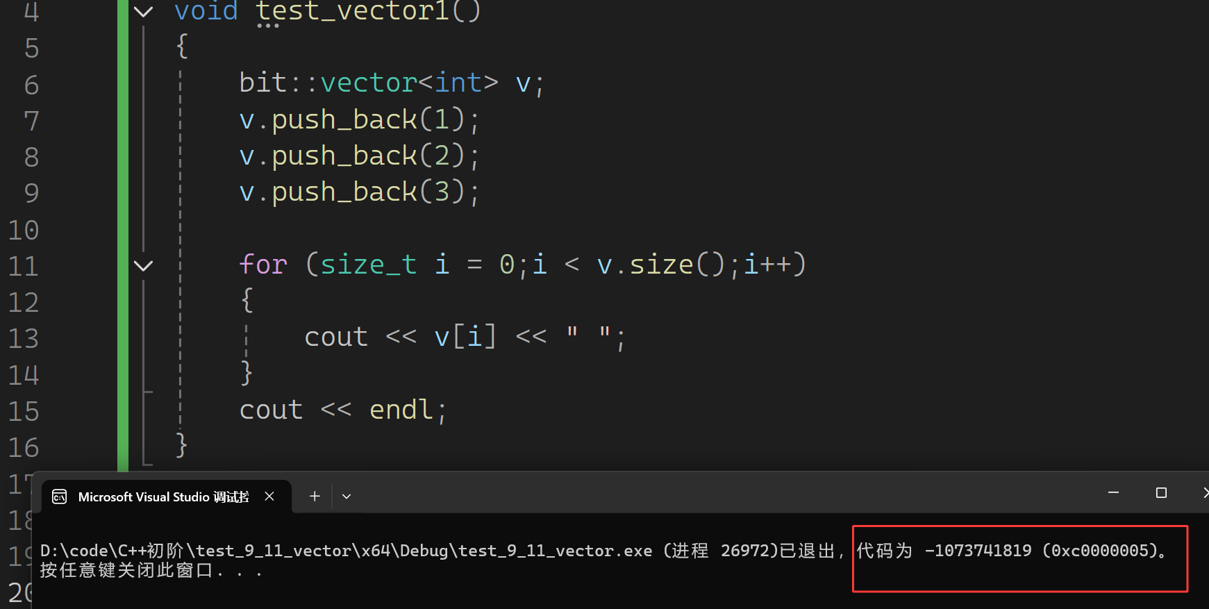 看似目前没有任何问题,都是模仿string来实现的,但是下面这个测试用例程序就崩溃了。