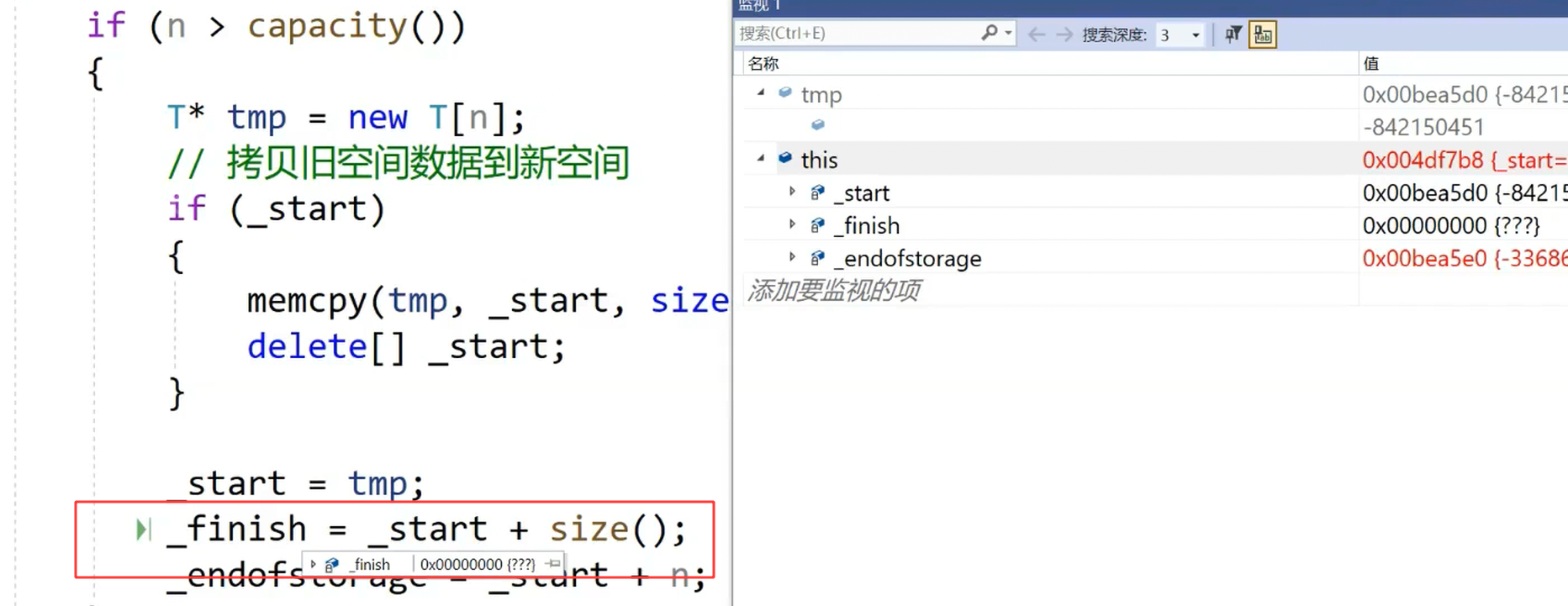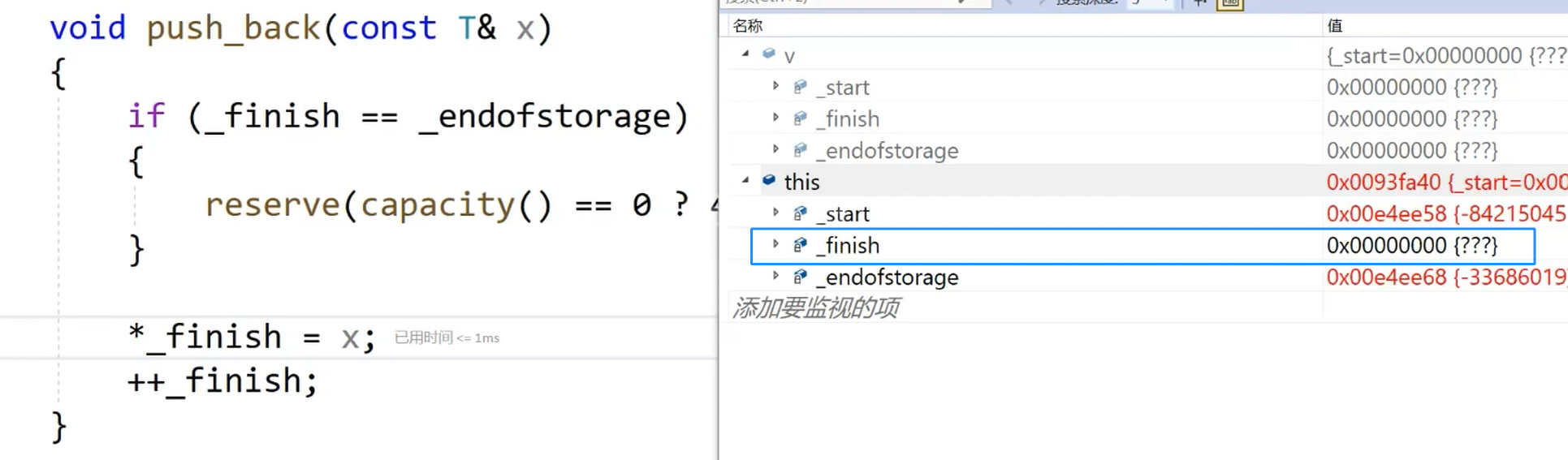 可以发现,_start 和 _endofstorage 都没有问题,并且二者之间相差16个字节。出现问题的就是_finish,_finish的值为空!也就是说红色框中的这一行代码出现了问题。