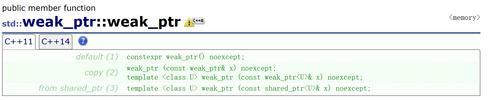 为了解决上面的问题,C++11设计出来了weak_ptr,翻译过来就是弱指针。它完全不同于之前所讲的智能指针,它不支持RAII,也就意味着不能用它直接管理资源。所以我们看文档发现,weak_ptr构造时不支持绑定到资源,只支持绑定到shared_ptr,当绑定到shared_ptr时,不增加shared_ptr的引用计数,那么就可以解决上述的循环引用的问题。