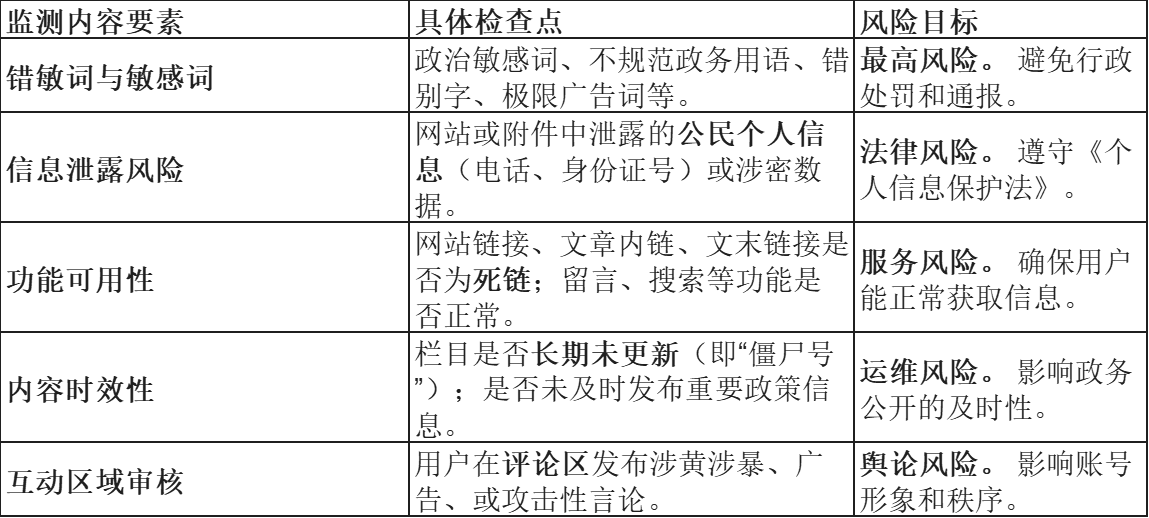 这是政务新媒体监测的核心和底线,旨在确保发布内容合法合规,避免被监管部门通报。