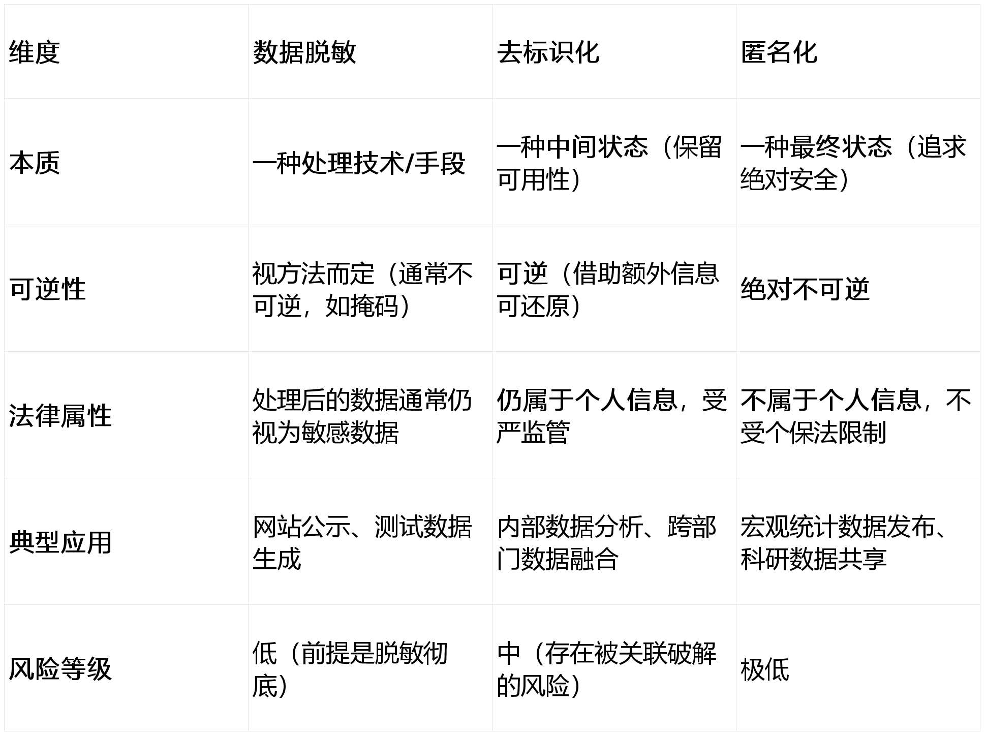 - 手段与结果: “脱敏”是实现“去标识化”或“匿名化”的一种具体技术手段(如使用掩码、截断、噪声添加等算法)。