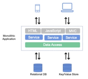 在应用程序发展的早期,大部分软件项目是将所有的服务端功能 模块打包到单个巨石型(Monolith)应用(典型的三级架构,前端 (Web/Wap/APP)+中间业务逻辑层+数据库层。这是一种典型的 Java Spring mvc 或者 Python Django 框架的应用)中,如很多企业的 Java 应用程序打包为 war 包然后发布到 Tomcat中,其架构图如下所示:
