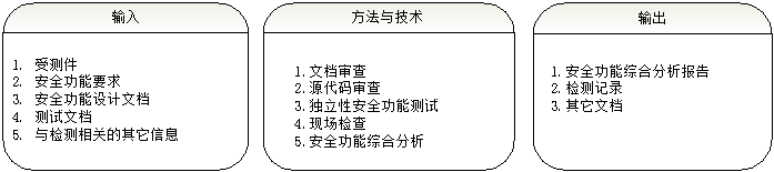 安全功能检测的特点是按对象(安全功能)所在的层次而展开,对检测结果评估的方法是对照结果与协议具体条目的符合与否。