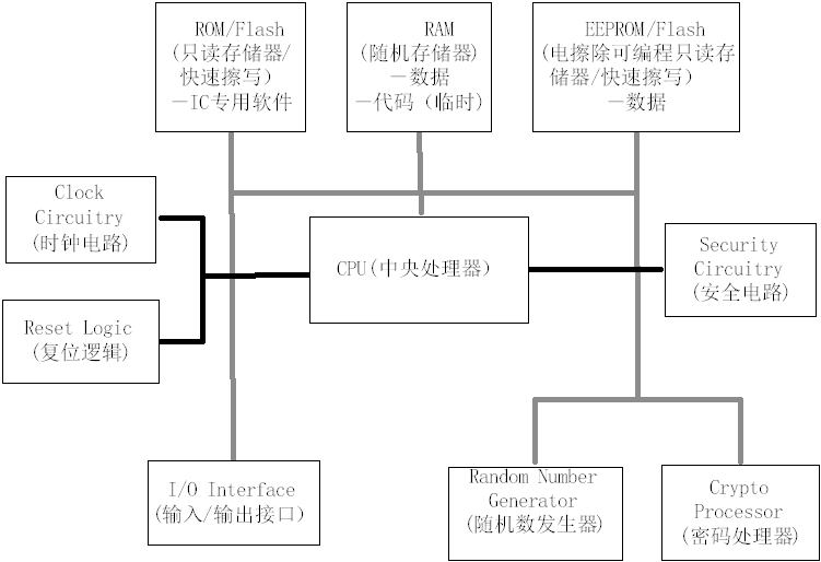 智能卡芯片由微处理器、安全电路组件、时钟电路、复位逻辑和输入/输出端口和存储器组成,可能还有硬件的随机数发生器和密码算法协处理器。芯片还可包括用于制作期间的检测专用软件。专用软件(也称为芯片固件),除检测外也可提供附加服务(如COS可调用的底层程序库)。除芯片专用软件外,芯片中还可能包含进行检测的硬件。在芯片上运行的所有其它软件都称为嵌入式软件,不属于芯片的一部分。见图3。