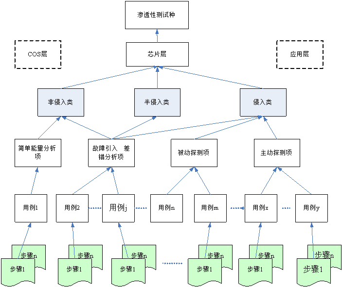 考虑作为受测件的智能卡的自然逻辑层面实际对应智能卡产业链的不同环节,与各类攻击手段的性质、特点,对智能卡的安全检测活动建立如下分级框架: