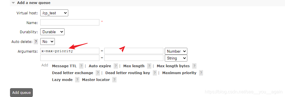 方式一:可以通过RabbitMQ管理界面配置队列的优先级属性,如下图的x-max-priority