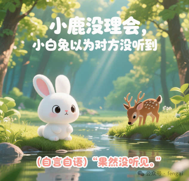 | 1.画面:春日森林,阳光透过树叶洒下,小白兔蹲在河这边草地上,耳朵竖起,眼神充满疑惑,远处河对岸的小鹿低头吃草。文字:小白兔怀疑小伙伴们听力有问题。字幕:(疑惑的声音)“大家听力都有问题吗?” 2.画面:小白兔突然眼睛一亮,站起来朝着河对岸的小鹿挥动前爪,嘴巴大张。文字:发现河对岸的小鹿,大声呼喊。字幕:“小鹿、小鹿、你在干嘛?” 3.画面:小鹿保持低头吃草的姿势,没有任何回应,小白兔皱着眉头,耳朵耷拉下来。文字:小鹿没理会,小白兔以为对方没听到。字幕:(自言自语)“果然没听见。” 4.画面:小白兔蹚进河中,水溅到身上,它伸长脖子,继续朝着对岸的小鹿呼喊,表情焦急。文字:跑到河中间再次呼喊小鹿。字幕:“小鹿、小鹿、你在干嘛?” 5.画面:小鹿依旧安静吃草,小白兔满脸难以置信,耳朵气得抖动。文字:小鹿还是没反应,小白兔更着急了。字幕:(生气)“怎么还没反应?” 6.画面:小白兔快速从河中跑到岸上,撒腿朝着小鹿的方向飞奔,身后扬起尘土。文字:小白兔冲向小鹿。字幕:无 7.画面:小白兔跑到小鹿身边,用前爪用力拍小鹿的背,瞪大眼睛,嘴巴愤怒地张开。文字:来到小鹿身边质问。字幕:“我说你耳聋呀,我叫你你怎么不回应呀。” 8.画面:小鹿慢悠悠地扭过头,脸上带着无奈的表情,嘴巴微张。文字:小鹿扭头回应小白兔。字幕:“听到了,我已经回答你 3 次了。” 9.画面:小白兔愣住,耳朵僵住,嘴巴保持张开状态,脸上露出尴尬的神情。文字:小白兔惊讶又尴尬。字幕:(尴尬)“啊?” 10.画面:小鹿继续低头吃草,小白兔站在一旁,挠着脑袋,一脸窘迫。文字:小白兔意识到误会,场面尴尬。字幕:(内心独白)“原来是我没听见......” |