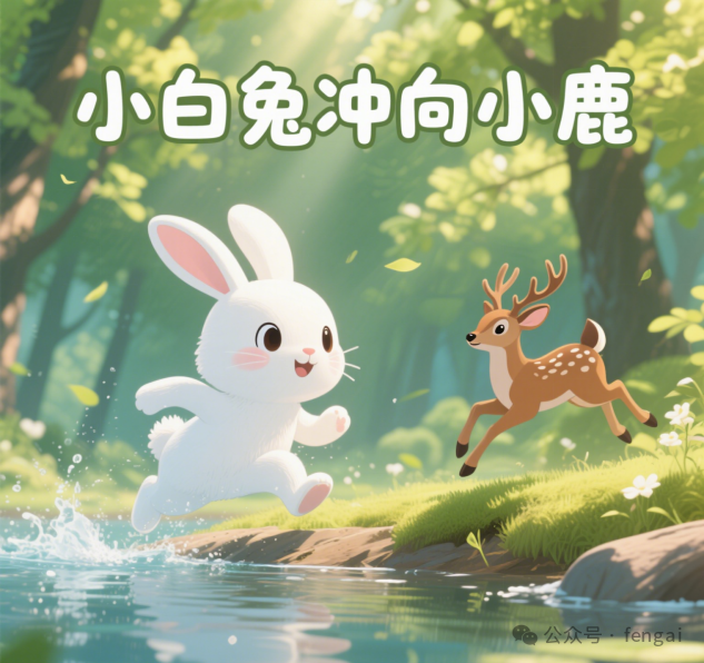 第六幕场景:小白兔快速从河中跑到岸上,撒腿朝着小鹿的方向飞奔,身后扬起尘土。画面中上部显示文字 “小白兔冲向小鹿”,画面下边无字幕。