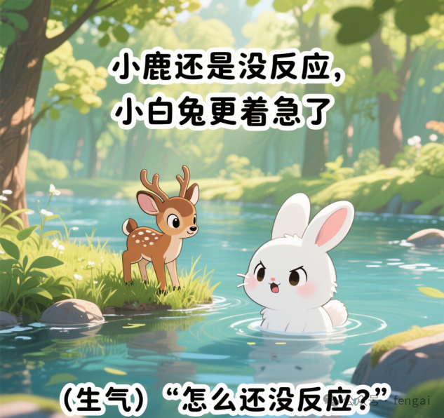 第五幕场景:河对岸的小鹿依旧安静吃草,站在河中间的小白兔满脸难以置信,耳朵气得抖动。画面中上部显示文字 “小鹿还是没反应,小白兔更着急了”,画面下边显示字幕 “(生气)‘怎么还没反应?’”