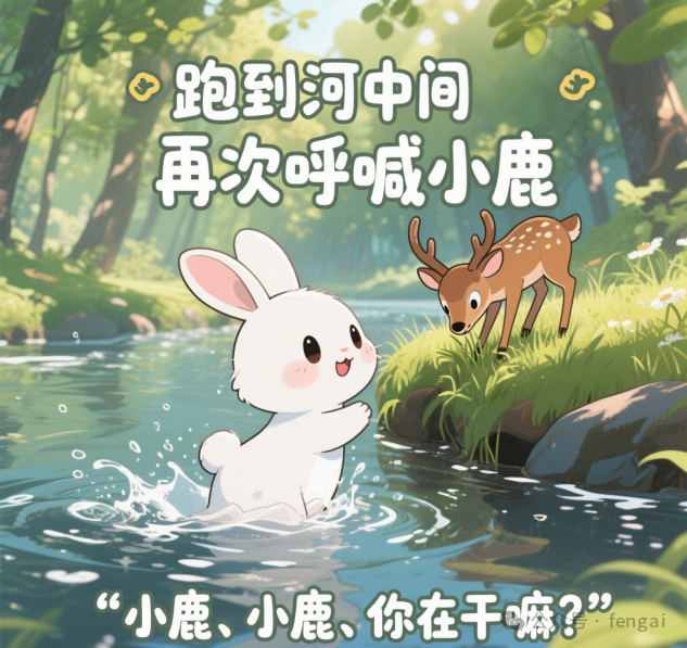 | 一只小白兔怀疑所有的小伙伴听力有问题,有一天看见河对岸的小鹿,于是大声喊道:小鹿、小鹿、你在干嘛? |