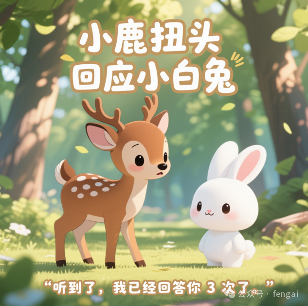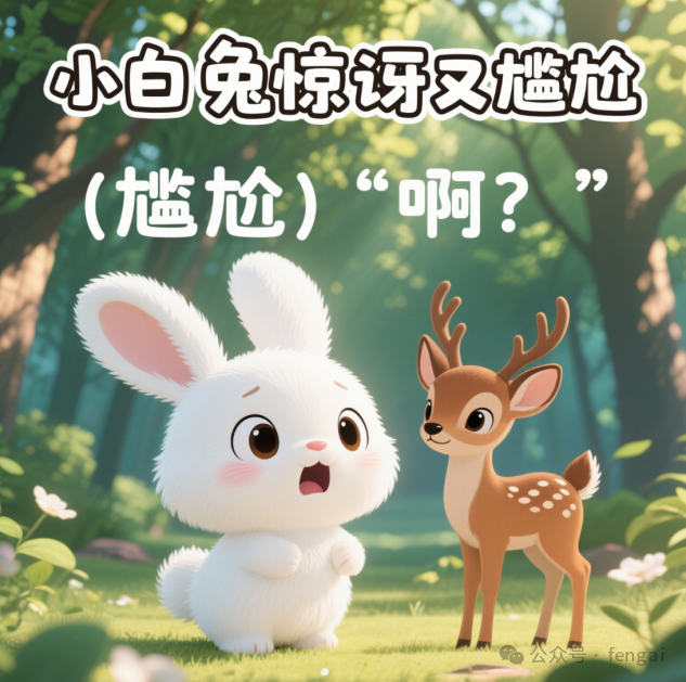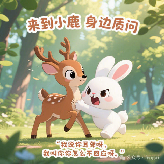 | 按以下内容生成10张图,要求文字显示在画面中上部,并在画面下边显示字幕。画面:春日森林,阳光透过树叶洒下,小白兔蹲在河这边草地上,耳朵竖起,眼神充满疑惑,远处河对岸的小鹿低头吃草。文字:小白兔怀疑小伙伴们听力有问题。字幕:(疑惑的声音)“大家听力都有问题吗?” 画面:小白兔突然眼睛一亮,站起来朝着河对岸的小鹿挥动前爪,嘴巴大张。文字:发现河对岸的小鹿,大声呼喊。字幕:“小鹿、小鹿、你在干嘛?” 画面:小鹿保持低头吃草的姿势,没有任何回应,小白兔皱着眉头,耳朵耷拉下来。文字:小鹿没理会,小白兔以为对方没听到。字幕:(自言自语)“果然没听见。” 画面:小白兔蹚进河中,水溅到身上,它伸长脖子,继续朝着对岸的小鹿呼喊,表情焦急。文字:跑到河中间再次呼喊小鹿。字幕:“小鹿、小鹿、你在干嘛?” 画面:小鹿依旧安静吃草,小白兔满脸难以置信,耳朵气得抖动。文字:小鹿还是没反应,小白兔更着急了。字幕:(生气)“怎么还没反应?” 画面:小白兔快速从河中跑到岸上,撒腿朝着小鹿的方向飞奔,身后扬起尘土。文字:小白兔冲向小鹿。字幕:无 画面:小白兔跑到小鹿身边,用前爪用力拍小鹿的背,瞪大眼睛,嘴巴愤怒地张开。文字:来到小鹿身边质问。字幕:“我说你耳聋呀,我叫你你怎么不回应呀。” 画面:小鹿慢悠悠地扭过头,脸上带着无奈的表情,嘴巴微张。文字:小鹿扭头回应小白兔。字幕:“听到了,我已经回答你 3 次了。” 画面:小白兔愣住,耳朵僵住,嘴巴保持张开状态,脸上露出尴尬的神情。文字:小白兔惊讶又尴尬。字幕:(尴尬)“啊?” 画面:小鹿继续低头吃草,小白兔站在一旁,挠着脑袋,一脸窘迫。文字:小白兔意识到误会,场面尴尬。字幕:(内心独白)“原来是我没听见......” |