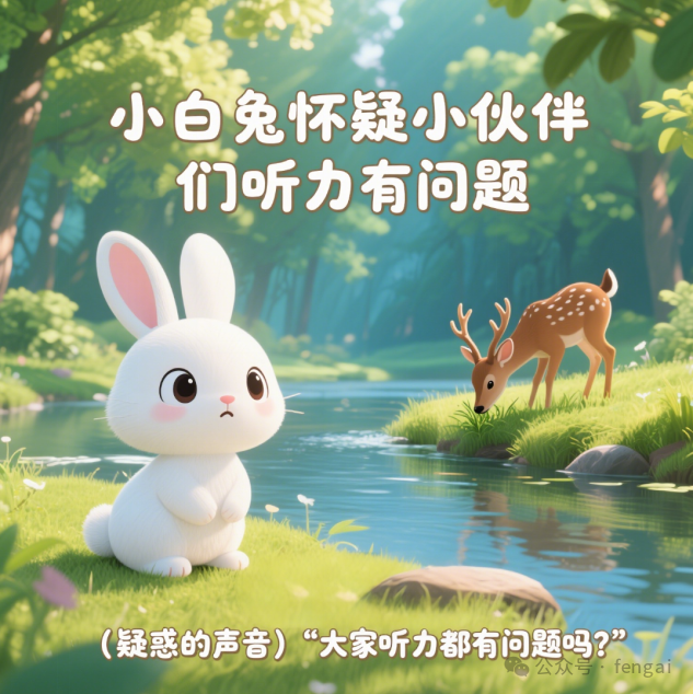 第一幕场景:春日森林里,阳光洒下,河这边的草地上,小白兔蹲在那里,耳朵竖起,眼神疑惑,河对岸小鹿在低头吃草。画面中上部显示文字 “小白兔怀疑小伙伴们听力有问题”,画面下边显示字幕 “(疑惑的声音)‘大家听力都有问题吗?’”