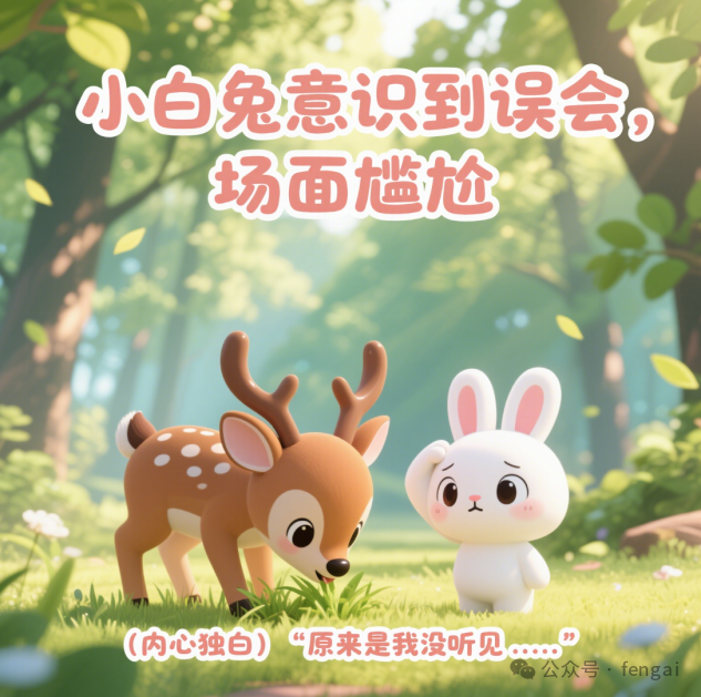 第十幕场景:小鹿继续低头吃草,小白兔站在一旁,挠着脑袋,一脸窘迫。画面中上部显示文字 “小白兔意识到误会,场面尴尬”,画面下边显示字幕 “(内心独白)‘原来是我没听见......’”