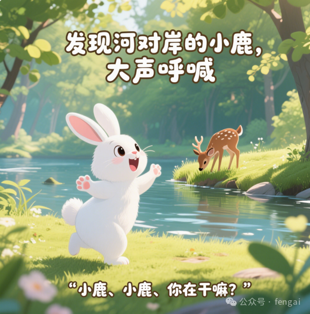 第二幕场景:小白兔突然眼睛一亮,站起来朝着河对岸的小鹿挥动前爪,嘴巴大张。河对岸的小鹿还低头吃草,显得很小。画面中上部显示文字 “发现河对岸的小鹿,大声呼喊”,画面下边显示字幕 “‘小鹿、小鹿、你在干嘛?’”