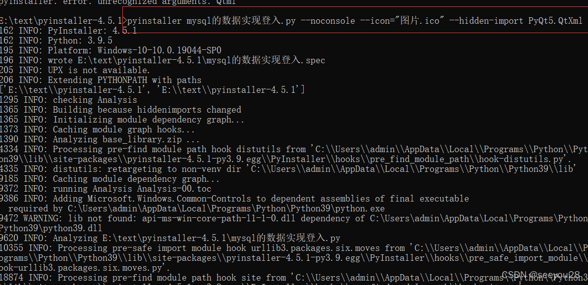 再写一个带qt界面的打包方法 pyinstaller 你的python文件.py --noconsole --icon="图片.ico" --hidden-import PyQt5.Qtml 空格得看清 如果你用的是pyside2你就把这句话里面的PyQt5换成PySide2.