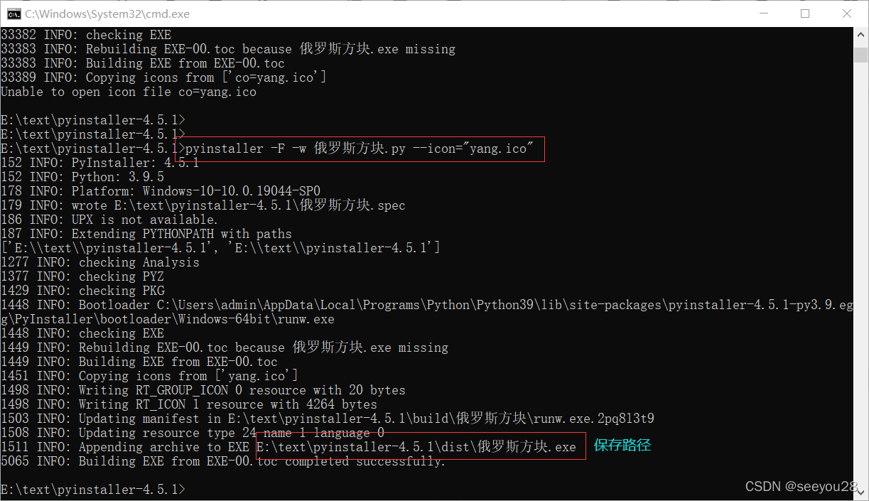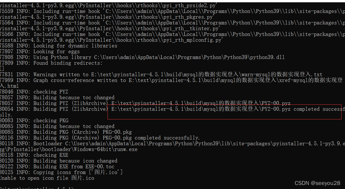 成功,报了一个错是因为没有这个ico图片,我打错了的问题。完成以后若有ui界面或使用到了文件夹需要自己把东西放在这个生成的文件夹里面。