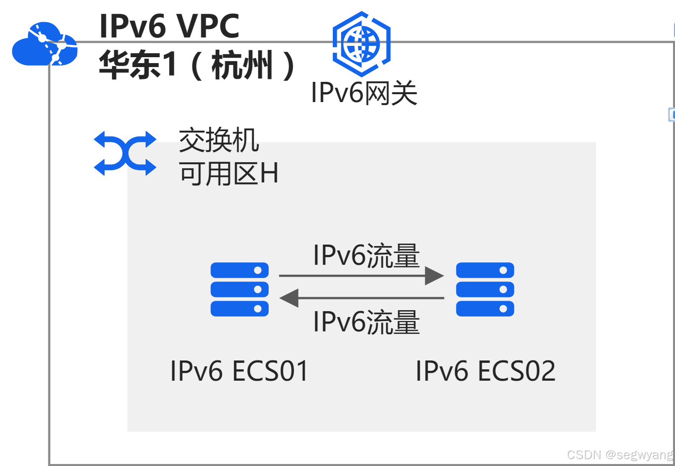 为实现以上目标,您可以在华东1(杭州)搭建一个具有IPv6网段的VPC和交换机,然后创建并配置具有IPv6地址的ECS01实例和ECS02实例,使ECS01实例和ECS02实例之间能够通过IPv6地址相互通信。