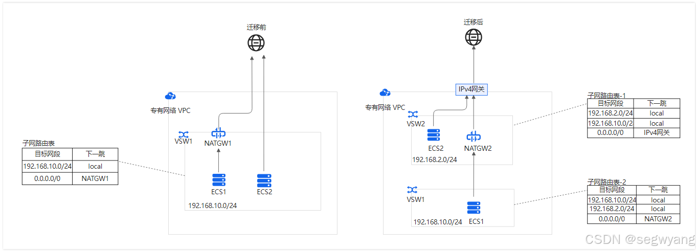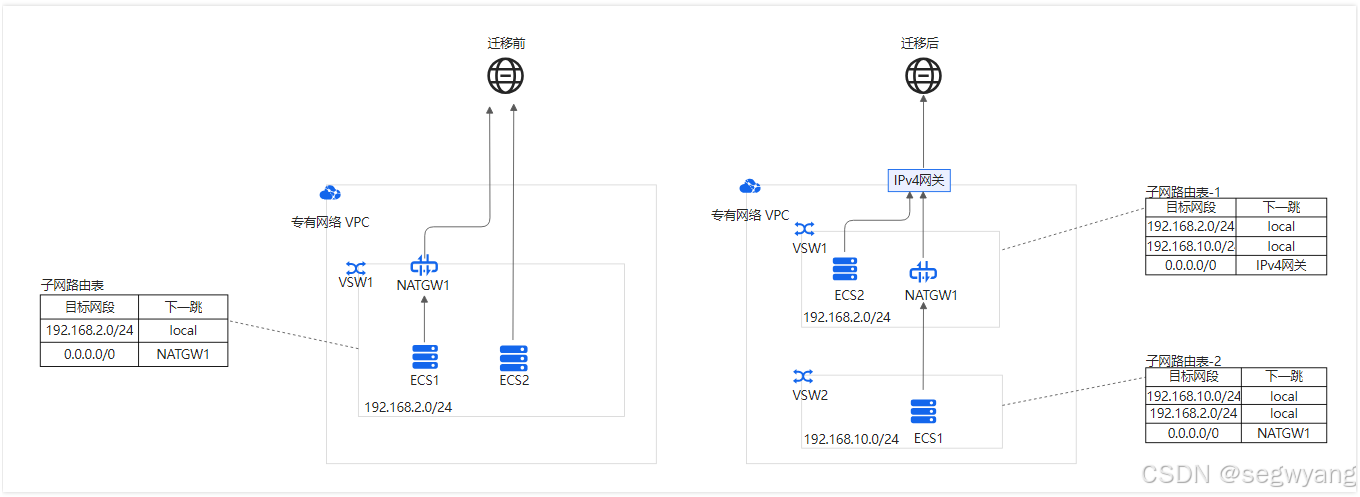 方式二:保留原有的公网NAT网关,将交换机VSW1上无公网IP的ECS迁移至新的交换机VSW2。