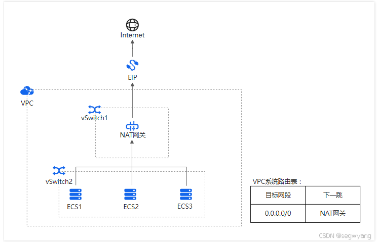 本文以下图场景为例。某公司在阿里云创建了专有网络VPC(Virtual Private Cloud)和交换机,交换机中创建了多个ECS实例。ECS实例均未分配固定公网IP,也未绑定弹性公网IP(Elastic IP Address,简称EIP)。现因公司业务发展,每台ECS实例都需要访问互联网。