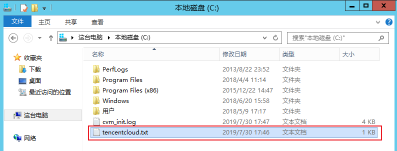 2. 在操作系统界面,打开 C:\ 盘,查看是否存在 tencentcloud.txt 文本文件。 如果存在 tencentcloud.txt 文本文件,则表示配置成功。如下图所示: