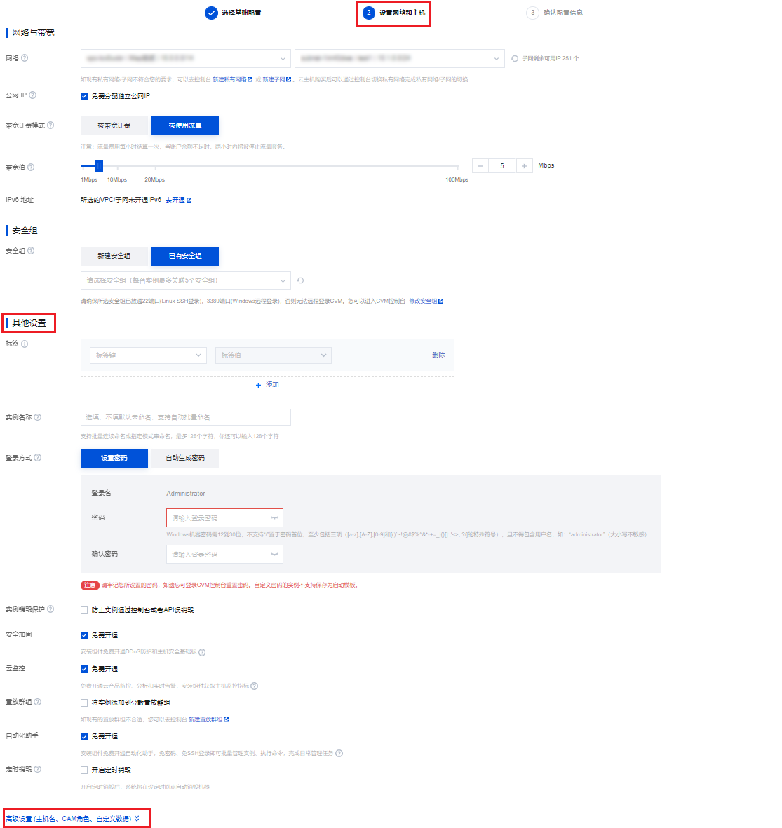 1. 参见 创建实例 购买实例,并在2.设置网络和主机中单击其他设置中的高级设置。如下图所示: