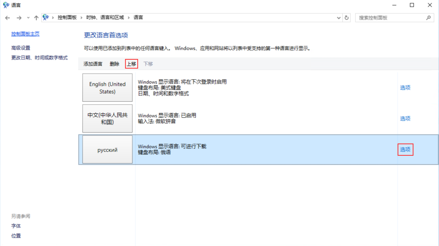4. 选中刚添加的俄语,单击上移,移到最顶端,再单击选项,如下图所示: