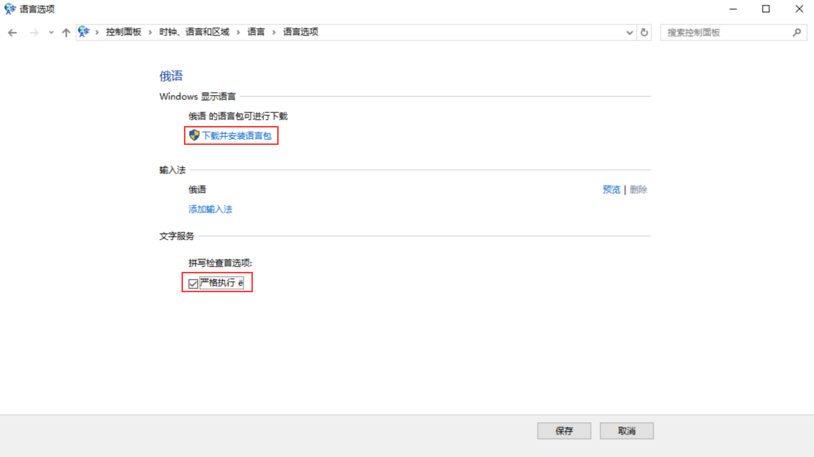 5. 勾选拼写检查首选项,然后单击下载并安装语言包 > 保存,如下图所示: