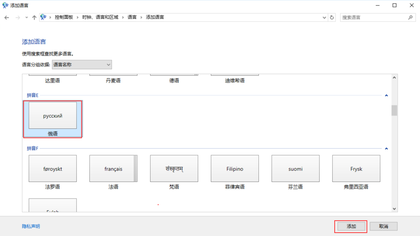 3. 在弹出的语言窗口中,单击添加语言,选择俄语 > 添加,如下图所示:
