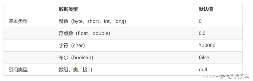 成员变量是具有初始值的,而局部变量没有,num为int类型,初始值为0,不同类型的初始值也不相同,如下图,是不同类型的成员变量对应的默认值。