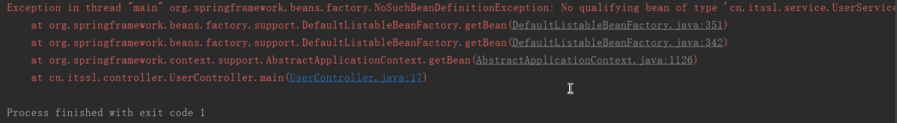 可以看到报错了,为什么会报错呢?原因就是因为目前虽然写注解了,但是没有告诉spring,它并不知道你要进行注解开发,所以需要在配置文件中告诉spring,我要用注解开发,你去寻找这些注解。