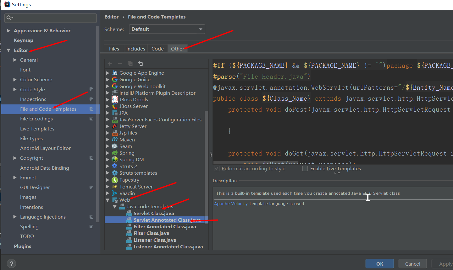 点击Editor,找到File and Code Templates,在右侧面板中找到Other,找到Web点击后Java code templates,找到Servlet Annotated Class.java